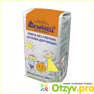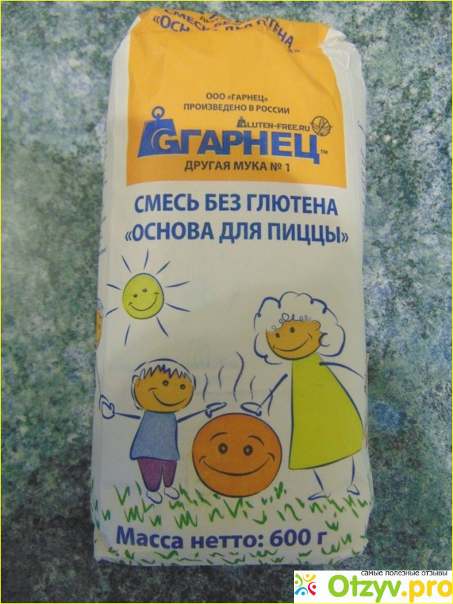 Итак, смесь «Основа для пиццы» без глютена, упаковка 600 грамм. Цена 140 рублей. Производитель – торговая марка «ГАРНЕЦ», Россия. В составе кукурузная и рисовая мука, кукурузный крахмал, пшенная мука, загуститель ксантановая камедь. На упаковке есть рецепт приготовления пиццы диаметром 25-30 мм. Рецепт: Смесь «Основа для пиццы», 0,5 ч. л. соли, 1,5 ч. л. сахара, 1 ч. л. сухих дрожжей, 1 яйцо, 1,5 ч. л. растительного масла, 125 мл воды. Сахар и дрожжи размешать в 50 мл теплой воды, оставить в теплом месте до вспенивания. Затем добавить все ингредиенты, хорошо вымесить и выложить в форму, застеленную пергаментной бумагой. Распределить по форме, придавая форму лепешки мокрыми руками. И поставить на полчаса в теплое место. После этого поставить форму в разогретую до 180 градусов духовку на 5-10 минут, вынуть – разложить начинку, сыр и снова в духовку разогретую до 200 градусов на 5-7 минут, до готовности пиццы.