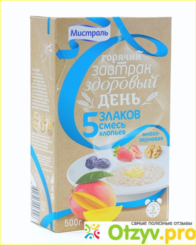 Как-то недавно муж предложил сварить молочную кашку, он еще тот любитель, он хотел рисовую или манную, я ни то ни другое не хотела, мне хотелось именно овсяную или из смеси хлопьев, поэтому пошла и купила пачку. Правда попались мне хлопья, которые не нужно варить, то есть для быстрого завтрака. Называются они - смесь хлопье Мистраль "5 злаков".