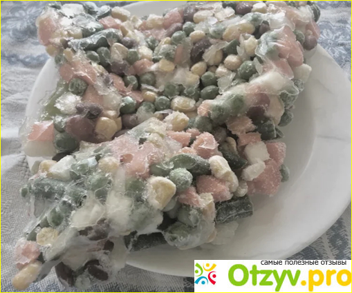 В упаковке при открытии вся смесь была заледеневшей. Не покрытой снегом, а именно во льду. Конечно, овощи отдают влагу, но не настолько же! О чем это говорит? Что вместо положенных 400 грамм овощей останется, дай бог, грамм 200 в сухом остатке. Выгодно, но не покупателю. Неплохо на воде зарабатывать, да? Сомневаюсь, что дело в неправильной транспортировке или хранении. Или овощи перед заморозкой были плохо просушены.