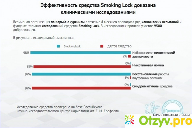 Более того, было проведено тестирование эффективности действия препарата Smoking Lock, в котором участвовали девять тысяч пятьсот человек.