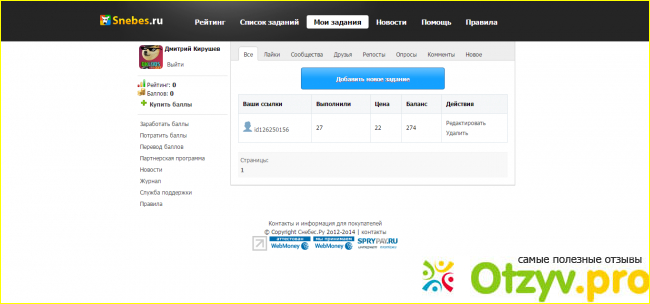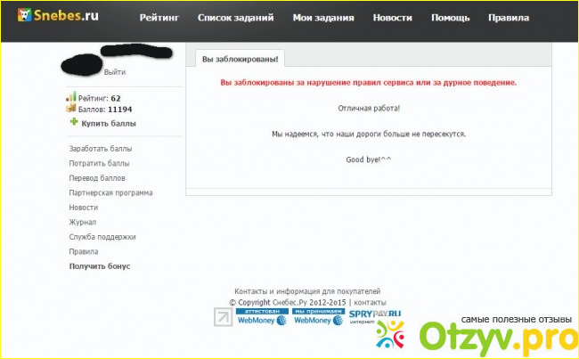 Нашел сайт, снебес ру называется, дизайн понравился, легкость в обращении тоже ничего, регистрироваться не надо, поэтому приступил к работе с ним, не почитав отзывов на других сайтах(что зря, пишут много о хитрых делах).... заработал себе баллов, создал задание, чтобы потратить их по назначению, а меня взяли и выкинули без объяснения причин, коих не должно быть, спасибо админам.... хорошо работаете, мелочные людишки...