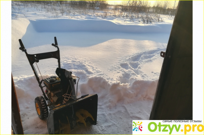 В отличии от электрического снегоуборочника (прошлую машину отдал сыну), я не привязан к питанию и провода не путаются под колесами. Да, присутствуют выхлопные газы, но их не много и они не бьют в лицо. С этим все нормально.