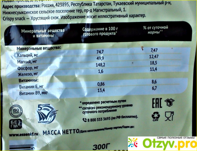 На обороте фольгированного пакета-информация о витаминах и минеральных веществах, информация о производителе, вес продукта.