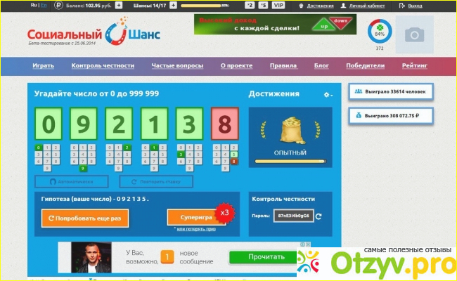 Анастасия. Это действительно свободная система с очень простыми правилами. Проходим регистрацию, после которой каждый день дается фиксированное количество шансов быть сыгранным. Принцип игры прост: нужно угадать число, которое произвела система бесплатной лотереи. Если 6 чисел угадали 1, то на баланс зачисляется 1 копейка, если угадали 2 - 10 копеек, 3 - 1 рубль, 4 - 10 рублей, 5 - 100 рублей, угадали все 6 чисел до 6 - 10 000 рублей. При балансе до 50 рублей и выше их можно показать в WMR, Яндекс-Деньгах или киви-кошельке. Выигрыши выплачиваются в течение длительного времени, в течение 2-4 недель с момента подачи заявления. Деньги накапливаются очень медленно. Играю уже второй месяц, на счетах - тридцать один рубль. Угадать сложно. Копейка и 10 копеек-как раз то, что надо, но угадать 1 рубль я получил умом на удачу. Сразу угадали четыре из шести - баланс +10 рублей. Но учитывая, что я трачу на это не более 10 минут в день, обычно утром, за чашкой кофе... Вы знаете, что я принесу на ваш счет WMR plus, что я выведу. Номера можно установить независимо, и возможно отжать кнопку "автоматически" и систему для генерации любого номера. Получив этот номер можно поменять вещь. Девушка предложила поставить все числа одинаковыми, тогда больше шансов угадать 1 или 2 числа. Я попробовал поставить в 4 числа-то же самое, и два по своему усмотрению. Я знал человека, который всегда ставит один и тот же номер. В общем, у каждого свои методы пророчества. Проект верный. Вы всегда можете проверить, какие цифры зашифрованы. Я не проверяла, но мой муж (а он программист по образованию) сказал, что он смотрел все вещи, очень честно, если программы имеют какую-то настройку, он заметил. Я ему верю. Проект-это затраты на рекламу, поэтому организаторы просят отключить Adblock-это программа, которая блокирует рекламу. Сам рекламный вид не нужен. Существует также реферальная программа. За приглашенных рефералов вы получаете 1 постоянное время каждый день и отвечаете за несколько пенсов, а не за реферальный доход и окупаете их за раз. В этой игре, только референт может предоставить больше возможностей для передачи. Пользуясь случаем, я приглашаю вас стать моим рефералом и обещаю иногда давать такую возможность. Вы можете попытаться получить больше шансов, если вы нажмете первую кнопку "поздравить" в чате, но это трудно. Но, узнав, что, честно говоря, это не его собственное мнение, предложила изменить мужу. Есть трюк вы можете сделать, чтобы захватить эти возможности. Готов рассказать об этом трюке для ваших рефералов. Что еще добавить? Понять игру не сложно. Большим плюсом является то, что лотерея на самом деле бесплатная. Вам не придется тратить деньги и можно выиграть несколько копеек.