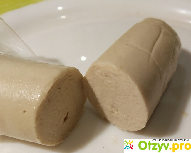 Я прекрасно знаю, что все вегетарианские заменители мяса часто не имеют выраженного вкуса. Но, если понять основные принципы их вкусного пригготовления, то все встает на свои места. Понадобится всего лишь соевый соус, чеснок, возможно томатная паста и специи и можно получить невероятно вкусное блюдо. Сосиски от вего чикен также не могут похвастаться своим ярким вкусом. К тому же они выглядят не как стандартные сосиски. Они полностью белые, мягкие, более паштетообразные. Но, при ровном срезе довольно неплохо держат форму.