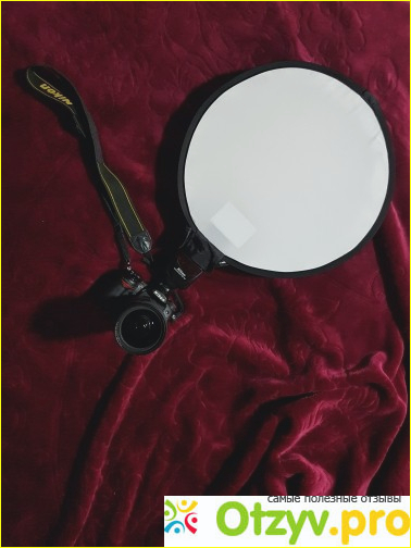 Софтбокс приличного качества, 31см в диаметре. Крепится тугой, широкой, тканевой резинкой к верхней части вспышки. Вспышка с этим аксессуаром работает в положении "в потолок".