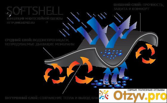 С течением времени даже особо рьяные поборники создания ткани «на все случаи жизни» отказались от задумки создать идеал. На данном этапе софтшелл – определенное количество типов двухслойного материала, каждый из которых обладает определенными свойствами. На данном этапе изготавливается мембраные и безмембранные сшитые ткани менуемые софтшеллами. Мембранные представляют собой трехслойную ткань, состоящую из гладкого стрейча, мембраны и флиса. В безмембранных софтшеллах имеются всего два слоя – стрейч плюс флисовая ткань.Я бы сказал, что такая куртка удобна, что бы быстро ее накинуть и добежать в ней до магазина, так как если она и промерзает, то происходит все это, не с той силой, как обычный батник. Главным образом, все это происходит потому, что такую куртку сложно продуть ветром, а если что то не продуваемо, то такая одежда, уже в разы больше и лучше держит тепло.