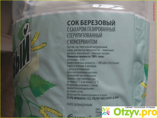 Бутылка такого сока содержит натуральный берёзовый сок, лимонную кислоту и в качестве консерванта используется бензоат натрия.