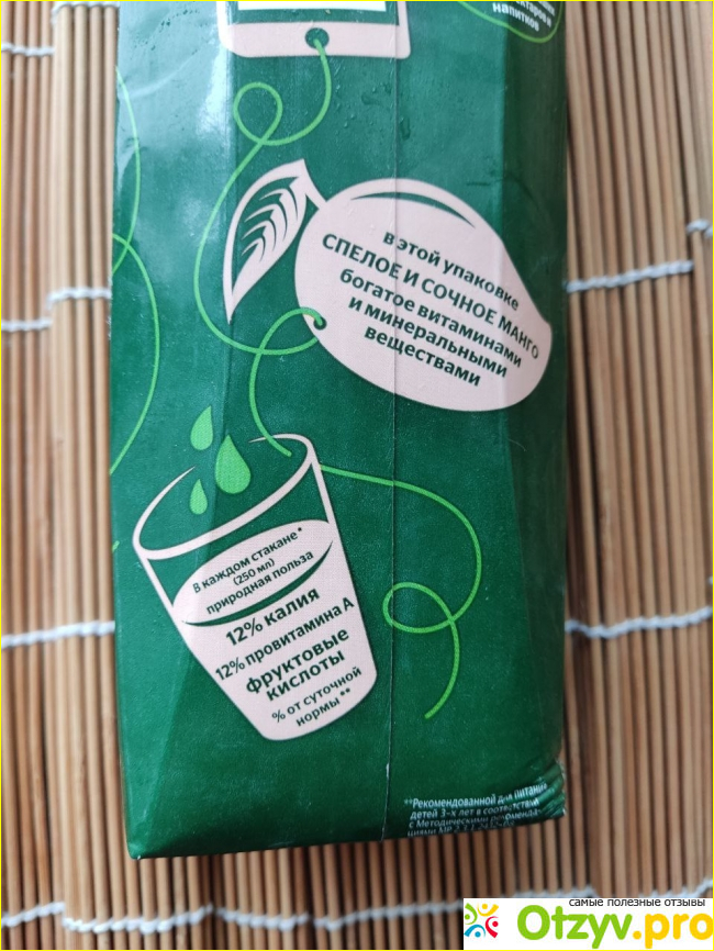 Как пришла домой, сразу выпила два стакана мангового сока. На вкус такой сладенький и вправду напоминает манго, да и насыщенный фруктовый. Похож немного на персиковый с айвой и абрикосами, с грушей. Меня порадовало, то что сок без консервантов и красителей, так как Я очень быстро выпила этот сок, час и всё, так как очень вкусный! Мне понравился манговый вкус, на днях снова его куплю.