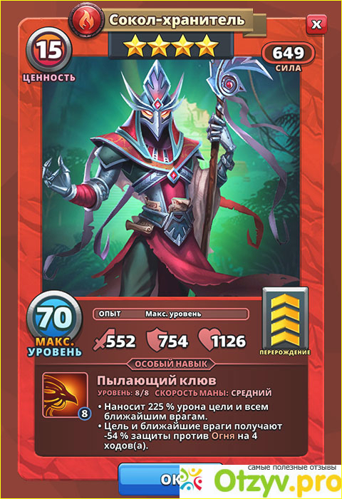 Сокол-хранитель относитсяк квестуХранителиТелтока. Это красный четырёхзвёздочный герой. У него отличные показатели защиты и здоровья.