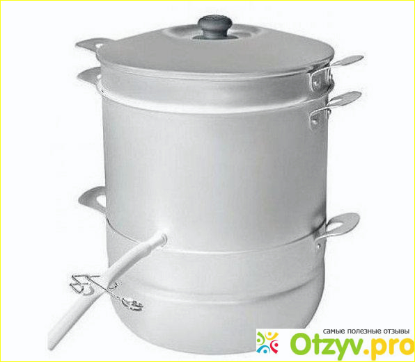 Когда во внешней емкости происходит кипение воды, то неизбежно происходит также образование пара, проходящего через отверстия в другой емкости. Она является достаточно сложной хитроустроенной деталью, которая предназначена для сбора образующегося сока. Снизу этой емкости имеется специальная отводная трубка, которая снабжена зажимом. Она предназначена для того, чтобы образующий сок мог сливаться.