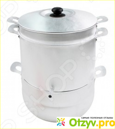 Устройство выглядит довольно просто и состоит из пищевого алюминия. Имеет поддон для воды, крышку, сокосборник и дуршлаг для фруктов.