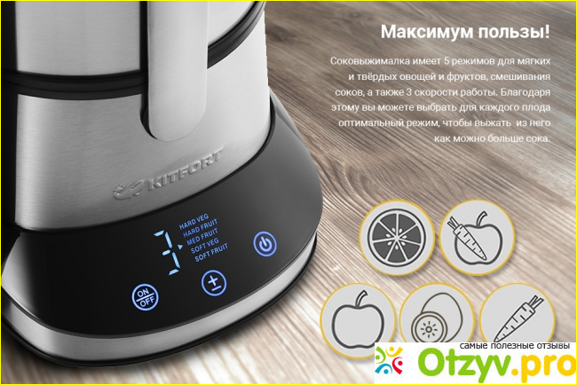 Немного посмотрели информацию в интернете, потом прошлись по магазинам, и в итоге выбрали соковыжималку kitfort кт-1112. Соковыжималка эта довольно большая, но вместе с тем она очень легкая в освоении и управлении. Разобрались с ней очень быстро, всего за 1 час. Она снабжена сенсорным экраном, и таким образом можно выбрать необходимый режим, - всего же здесь присутствует 5 режимов. Если разобраться, то здесь есть всё, что необходимо. Присутствует необходимая памятка о режимах, а также как ими нужно пользоваться.