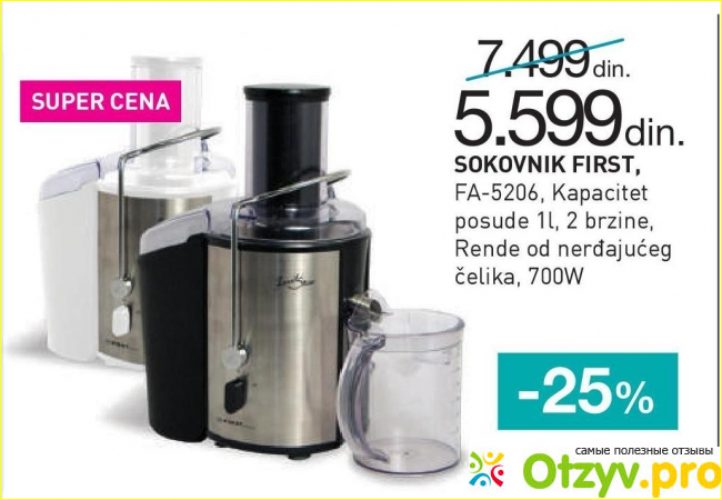 Как раз об одном таком варианте и пойдет речь в данной статье. А речь пойдет о соковыжималке First 5206-1. Эта модель появилась в продаже достаточно давно. Поэтому многие покупатели уже успели приобрести ее для домашнего использования. Причем большее количество отзывов об этом приборе положительное.
