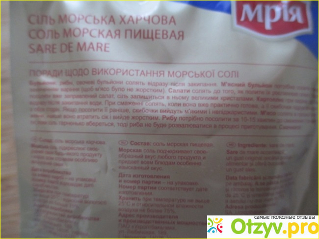 Из всех производителей соли мне больше всего понравилась торговая марка Мрия. Соль этой ТМ продается в удобной упаковке, которая открывается и закрывается на замочек Zip-Lock. Чем надежно защищает сам продукт от посторонних запахов и от случайного высыпания продукта из пакетика. Также можно отдельно приобрести мельничку для помола соли. Она очень хорошего качества и многоразового использования.