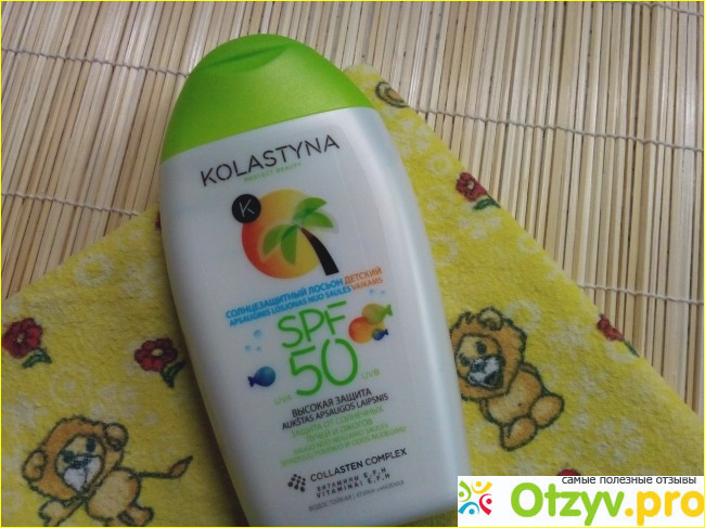 В этом году лето было очень жарким. Поэтому я отправилась в аптеку для выбора средства от ультрафиолетовых лучей для своей одиннадцати месячной доченьки. Фармацевт мне порекомендовала солнцезащитный лосьон детский с витаминами E,F, H "Kolastyna".