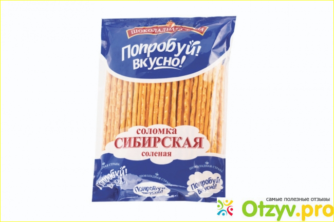 Одно название соломки говорит, о том, что ее стоит пробовать. Оправдания ее название на все 100 процентов. Рекомендовать к ее приобретению могу точно. В составе вся информация на упаковке на русском языке. В состав продукта входит мука первого сорта, крахмал кукурузный, маргарин, сахар, соль, лимонная кислота, дрожжи и добавки. Калорийность продукта соломки сибирской составляет 364. Производят соломку соленую в нашей стране в городе Бердск.