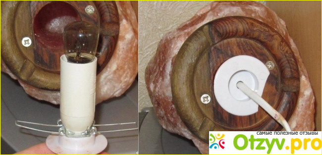 Внутри соляного конгломерата выкачивается полое пространство, куда вставляется электрическая лампочка и закрепляется там методом простого "распорного механизма". От лампочки тянется шнур для подключения к электрической сети.