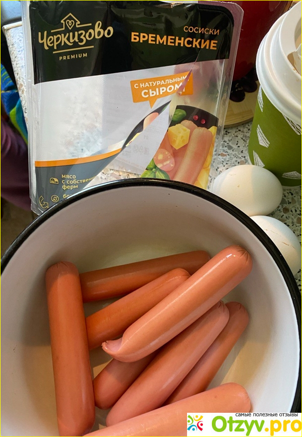 Плотные мясные сосиски бременские с добавлением сыра. Качественные и недорогие, с хорошим составом. В нем только мясной фарш специи и собственно, сыр.