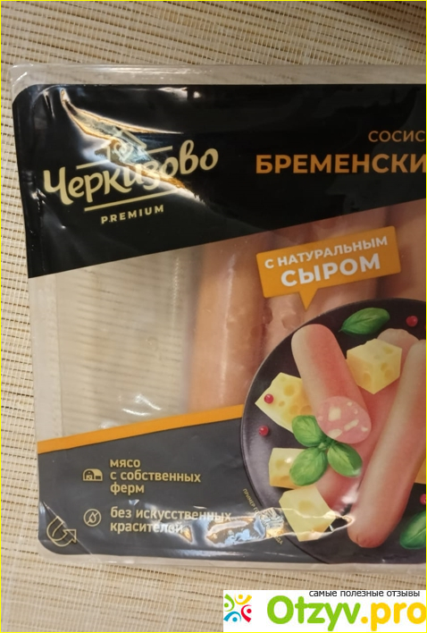 Эти сосиски продаются в лотке с черной этикеткой Черкизово Премиум, и еще упакованы в искусственную обертку. Что понравилось, что сыр в составе натуральный, поэтому сосиски называются не сырные, а именно с сыром. Мясной компонент свинина, в остальном обычный состав сосисок.