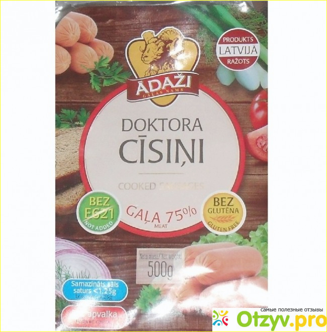На упаковке обещают отсутствие усилителя вкуса, глютена, сниженное содержание соли и мяса целых 75%, а также отсутствие какой-либо оболочки.