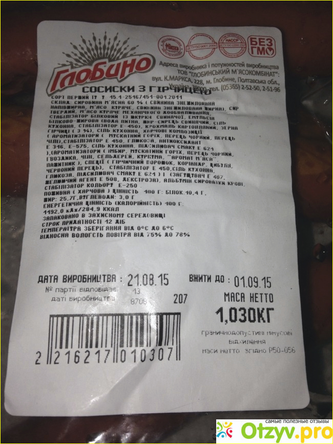 Весом все пакеты примерно по килограмму. Цена за килограмм таких сосисок в Ашане 62 гривны 87 копеек. За такую цену Сосиски с горчицей ТМ Глобино стоит купить и составить свое мнение о них.