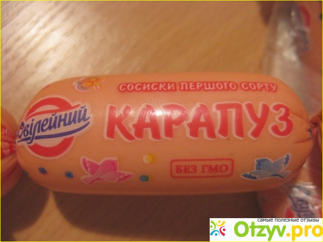 На самой обертке указано название, а также написано, что Сосиски первого сорта Юбилейный «Карапуз» не содержат ГМО в своем составе, что радует, когда собираешься давать продукт ребенку.