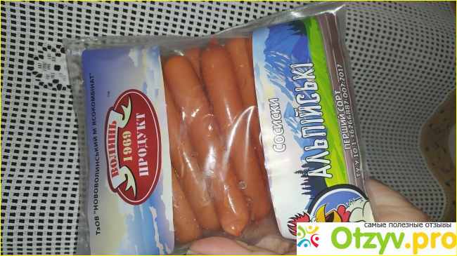 Всем доброго времени суток! Хотя сосиски вредные, иногда хочется отварить парочку на завтрак, или поджарить с яичницей. Одни из моих любимых сосиски варёные от марки "Волынь продукт" "Альпийские". Производит их Нововолынский мясокомбинат.