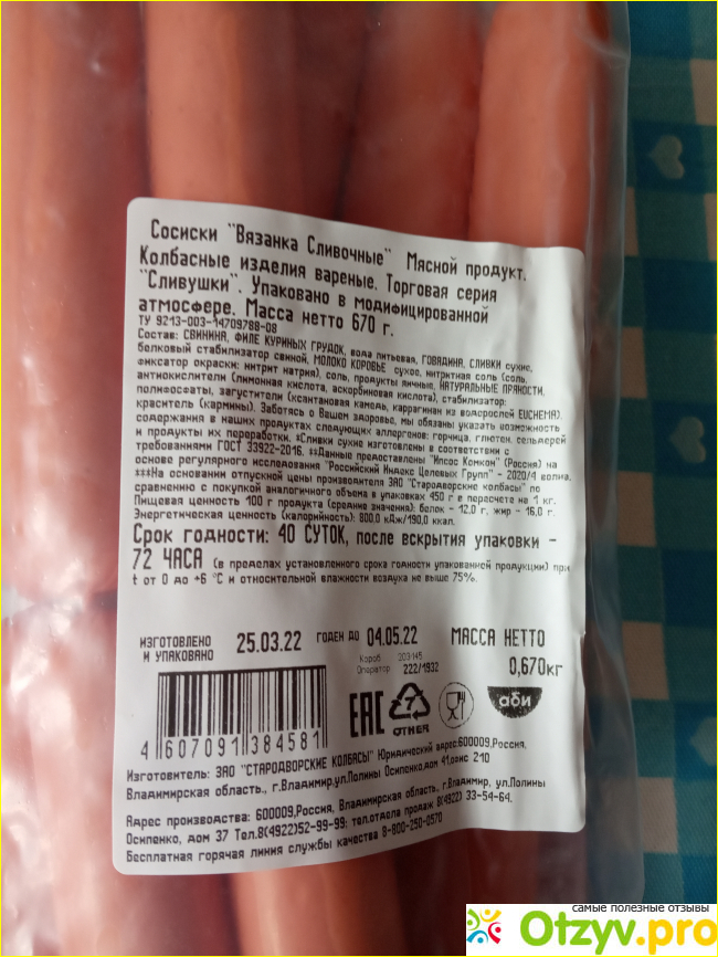 Изготовитель - ЗАО "Стародворские колбасы" из города Владимир. Производство находится в городе Владимир.