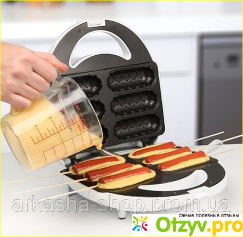С ее помощью в домашних условиях можно приготовить сосиски в тесте, или сардельки в тесте. К тому же сделать это будет намного проще, нежели в обычном случае с тестом на сковороде. Здесь имеется форма, в которую и вкладывается изделие. При условии, что правильно приготовлено тесто, у вас ничего не вылезет, и сосисочка получится стандартного, красивого, ровного размера. На фото показала, как это выглядит.
