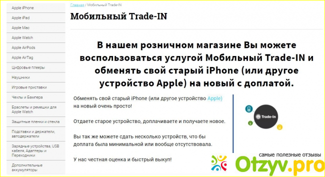 Интересно, что у них существуют даже услуга мобильного Trade-IN, то есть, когда вы любой свой старый аппарат компании Apple можете поменять на новый с доплатой. Очень интересное предложение особенно, если у вас накопилось несколько устройств от данного яблочного производителя. Главное, чтобы эти устройства не были сильно старыми и, например, для модельного ряда айфонов принимаются аппараты начиная только с 6-й модели. Но этой услугой нельзя воспользоваться дистанционно, а только, если посетить их магазин лично.
