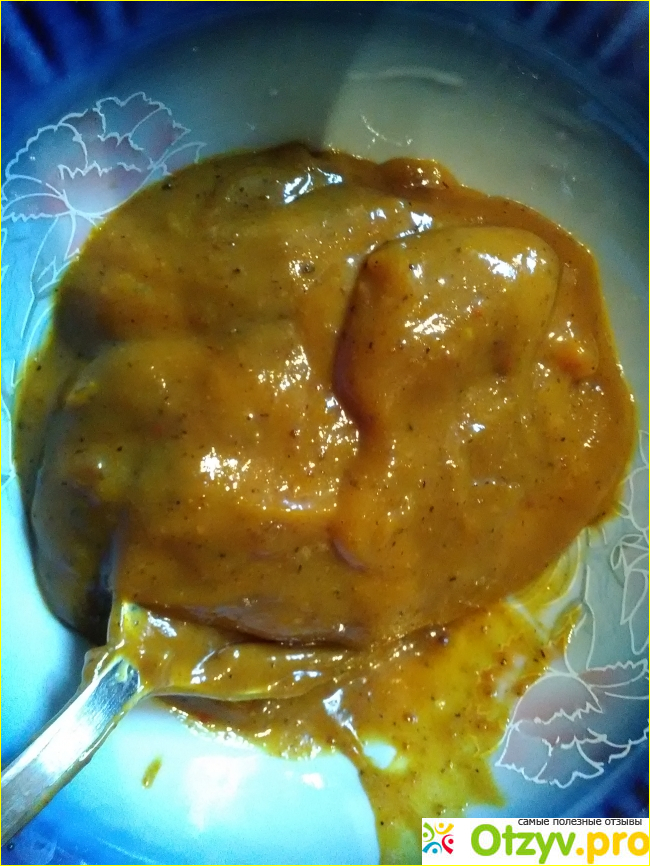 Если приглядеться там будут видны частица разных приправ. Предполагаю, что это красный или чёрный перец. Эти ингредиенты есть в составе. Чистый соус слегка островат на вкус, но его не едят в таком виде. Я его использовала следующим образом. Прожаренное мясо смешивают с соусом и тушат минут 5-7. Если требуется можно чуть-чуть добавить воды. Мясо получается пикантным, сочным и слегка пряным. В дополнительных специях оно не нуждается.