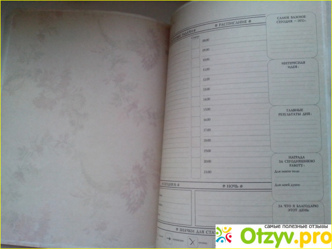 Блокнот большой, увесистый, благодаря совей обложке и плотным листам. Но, внутри всего 200 страниц. Ежедневник продуман и как планировщик. Владелец может спокойно расписать повседневные дела, на разлинованных страницах, и перейдя к следующему более нежному, фактурному развороту нарисовать что-то, вклеить наклейки или написать все что душе угодно. ежедневник направляет русло мыслей на позитив. Каждый день можно отмечать то, что радовало нас сегодня, какие книги мы читали, чему научились и так далее. Такие записи очень приятно пересматривать спустя время и просто анализировать.