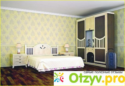Кровать двуспальная, но не слишком широкая. Меня это полностью устроило, т. к. спальня у нас небольшая. Изголовье у кровати не мягкое, но учитывая цену комплекта, на это не стоит обращать внимания. Тем более, что оформлено оно красиво.