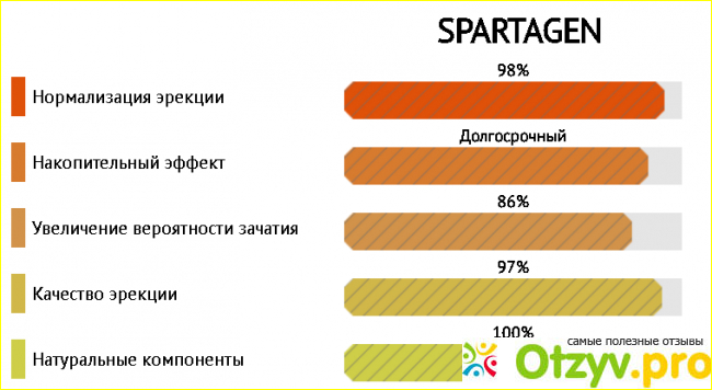 Если говорить о конкретных цифрах, то Спартаген был испытан не один раз. И согласно результатам нормализация эрекции наблюдались у мужчин в 98% случаев, кроме того медики зафиксировали улучшение качества спермы на 86%, что давало возможность большинству мужчин в любом возрасте стать отцами. Накопительный же эффект после приема продолжался в течение нескольких месяцев.