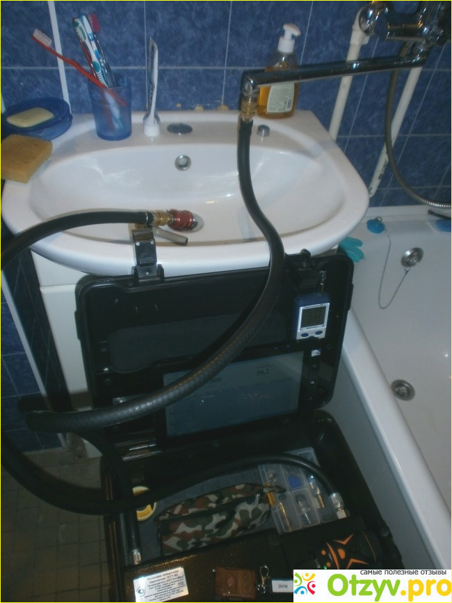 Я думал, что поверка производится как-то иначе, что счетчик снимают например или к счетчику подключают какой-то прибор. Оказалось, что все проще – поверитель подключает к крану прибор. Тот электронно замеряет скорость потока воды.