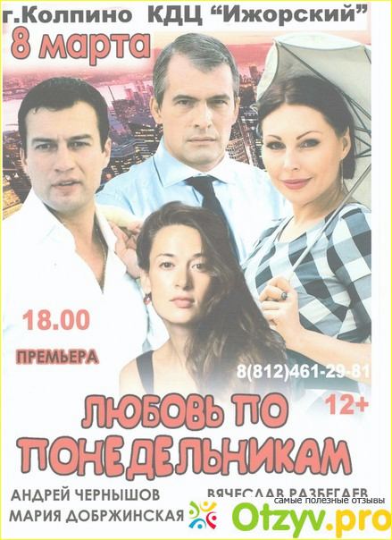 Афиша Спектакль "Любовь по понедельникам" в нашем Колпинском районе города Санкт-Петербурга появилась за два месяца до спектакля (8 марта). Сразу же привлек меня спекталь тем, что в нем играл любимый актер Андрей Чернышов, известный по многим фильмам ( любимыен из них - Колечко с бирюзой, две судьбы, Это моя собака). Как правило Андрей Чернышов всегда представлялся в паре с Марией Куликовой.