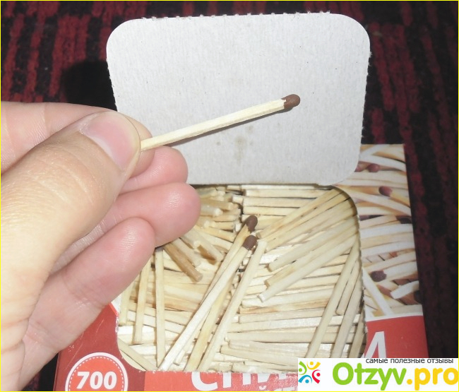 Сами спички на вид самые обычные, деревянная палочка и головка. Чем мне понравились эти спички - они горят долго, то есть всегда успеешь зажечь что нужно, мы с мужем даже прикалывались, он на балконе прикуривал от спички, а я эту же спичку несла на кухню и зажигала газ, успевала всегда дойти) Причем все спички качественно зажигаются, даже если на палочке совсем немного этого вещества, даже капелькой зажигаются, я пробовала бракованную спичку зажечь, не хуже чем нормальная загорелась.