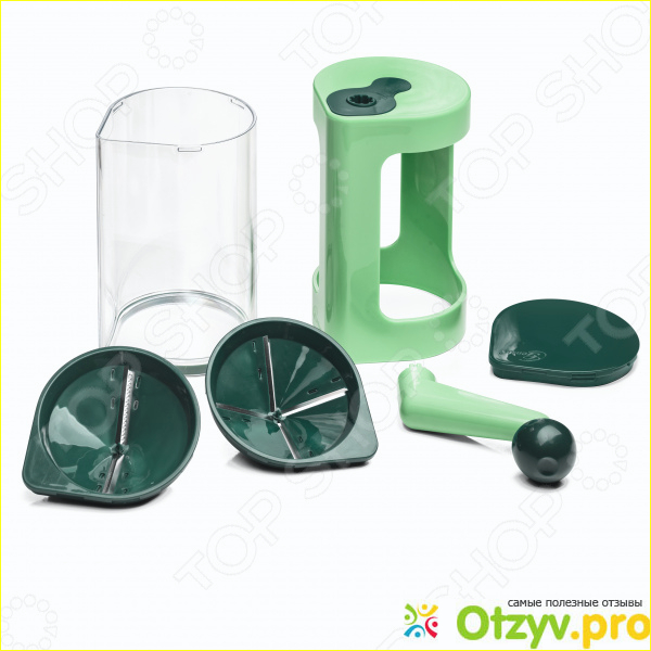 Данная модель выполнена в приятном зеленом цвете и некоторые элементы в том числе и насадки изготовлены из пластика в темно-зеленом цвете. В наборе покупателю представляется всего две насадки. У каждой насадки имеются вставки из нержавеющий стали, благодаря которым как раз и происходят нарезка фруктов и овощей. Кстати нужно понимать, что это устройство подходит исключительно для нарезки только фруктов и овощей.