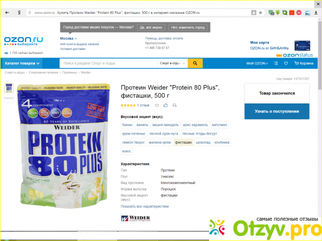 После родов хотела как можно быстрее привести себя в нормальную форму. Удалось хорошо похудеть, но мне необходимо было наоборот придать телу некоторые объемы, решила начать заниматься и искала для себя какой-нибудь не дорогой и так же качественный протеин. Покупала первый раз на пробу Спорт вейдер протеин 80+ Фисташки за 950 рублей 500 грамм, мне понравился, так что потом его еще повторно брала.
