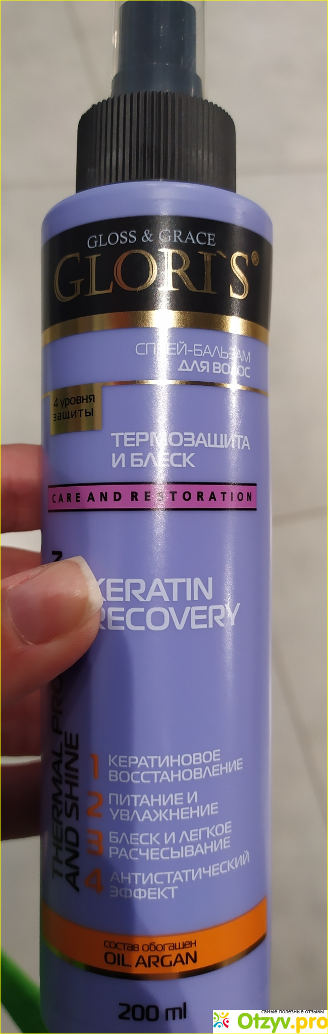 Этот спрей ещё содержит кератин, производитель обещает восстановление, питание и увлажнение.