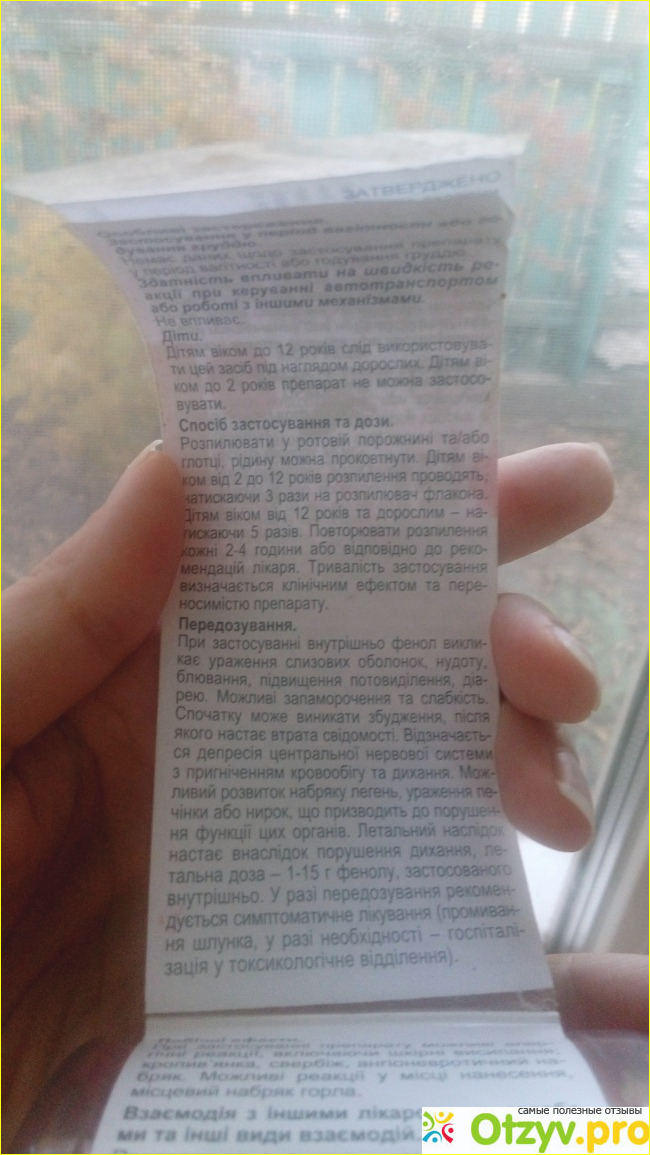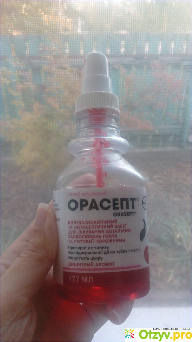 Спрей простой в использовании, детям достаточно распылить 3 раза, взрослым - нажимая 5 раз. Повторять распыление нужно каждые 2-4 часа. Себе я обычно брызгаю 3-4 раза, больше мне кажется будет лишним и просто часть лекарства глотается. Производитель пишет, что лекарство можно глотать, но изучив более подробно его состав, я поняла что зря лучше не глотать, состав не совсем безопасный. Средство содержит 14 мг фенола, ну и несколько вспомогательных веществ. Зачем-то производитель добавил ядрёный красный краситель, который мне кажется никчему. Вишневый ароматизатор производитель добавил для того, чтобы перебить неприятный запах и привкус фенола, но всеже он немного ощущается. Средство имеет привкус какой-то краски.