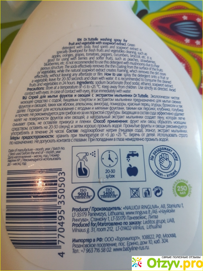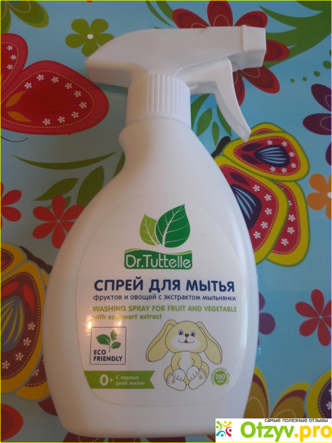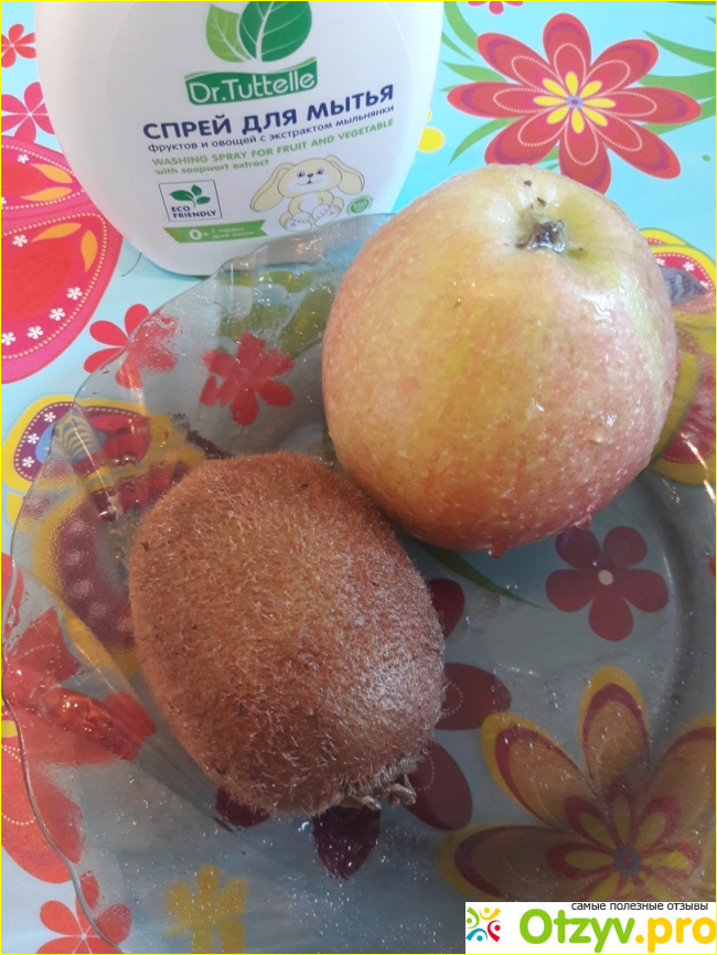 Спрей не имеет абсолютно никакого цвета, запаха и не оставляет после себя привкус. Полностью и быстро смывается с еды. Твердые фрукты и овощи промывает до скрипа всего за несколько секунд.