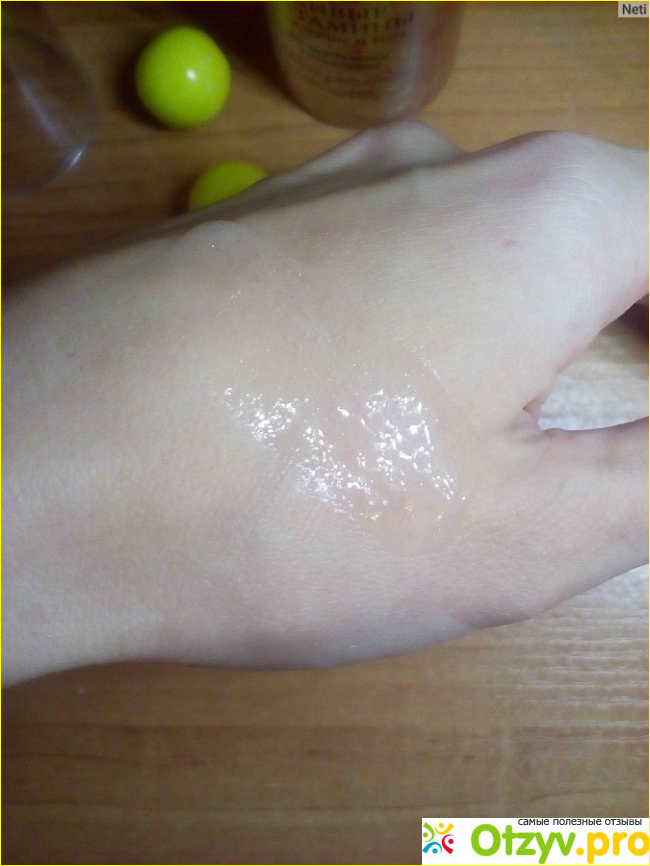 Рассматривая товары мой взгляд упал на эту бутылочку, сначала мне показалось, что это блёстки для волос и тела. Но это все из-за оригинальной формы данного лосьона с добавлением блесток. Но сияния, как такового, практически нет ни на теле. Сама жидкость внутри — прозрачная, оранжеватая, желеобразная. Запах сладковатый, похожий на последний легкий шлейф каких-то духов. Эмульсия внутри не липкая.
