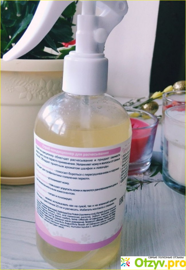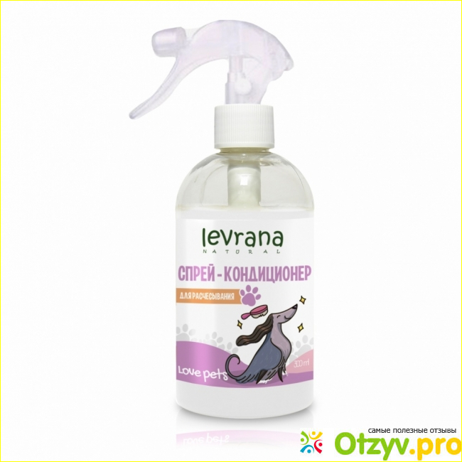 В общем, у нас десяток разных щеток и расчесок, которыми мы пользуемся на все случаи жизни. А недавно в моем арсенале появился спрей для расчесывания. Levrana Love pets. Это средство предназначено для облегчения расчесывания шерсти, увлажнения кожи и волос. Содержит экстракты лаванды и хмеля. Обладает ранозаживаляющими и антисептическими способностями.