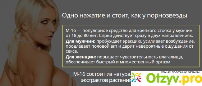 Спрей М-16 – это высокоэффективное средство для продления эрекции и усиления оргазма. Препарат позволяет быстро и безопасно увеличить длительность полового акта, не снижая при этом чувствительность нервных окончаний пениса и эрогенных зон. Изделие является отличным аналогом лекарственных препаратов и БАД. Одним из его основных преимуществ является скорость воздействия