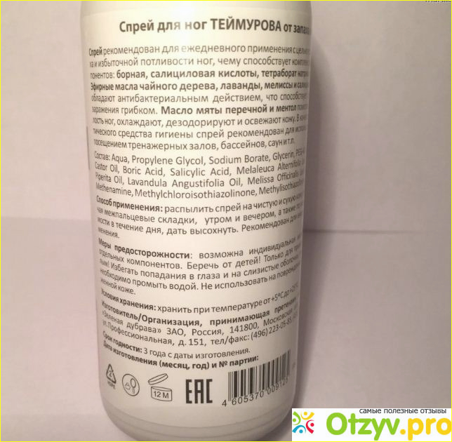 Спрей Теймурова для ног от запаха и пота является необходимым средством гигиены для каждого мужчины и женщины, которые следят за гигиеной своего тела. Производителем этого очень полезного косметического гигиенического средства является предприятие " Зеленая дубрава". Изготовление средства производится на территории Российской Федерации.