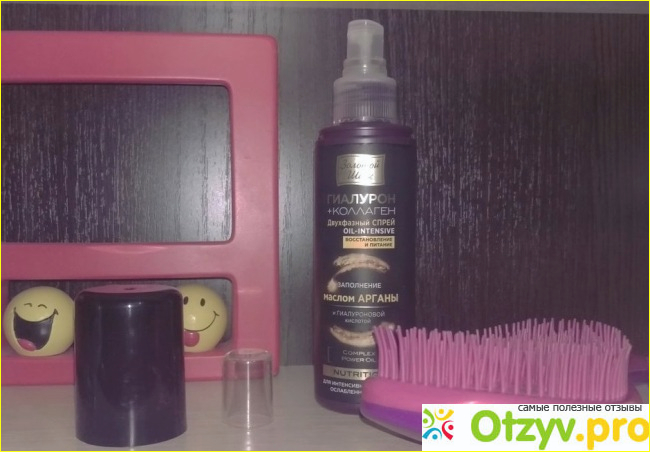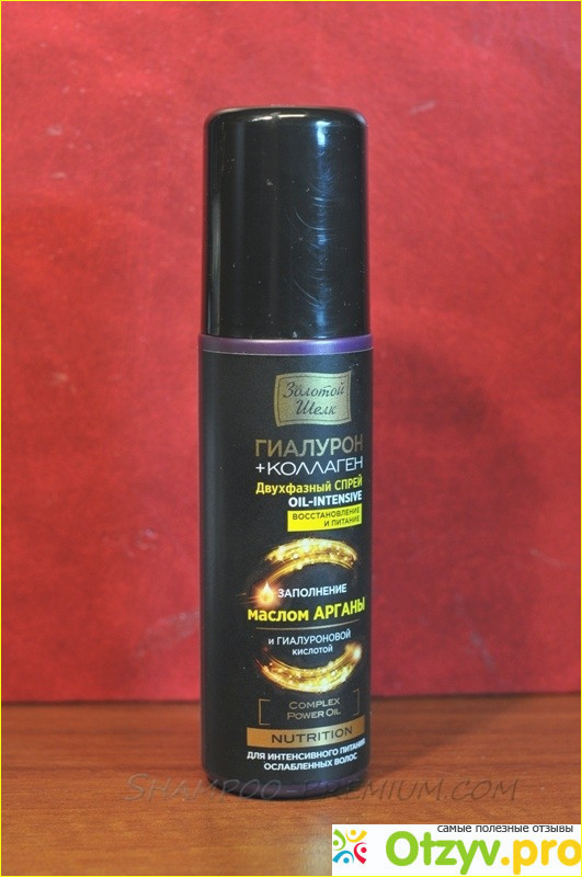 Двухфазный спрей Oil-Intensive Nutrition восстановление и питание Золотой Шелк я увидела в аптеке, ну и взяла, тем более, что в составе увидела масло арганы, которое мне нравится, гиалуроновую кислоту (она притягивает воду, а значит волосы будут не такими ломкими.