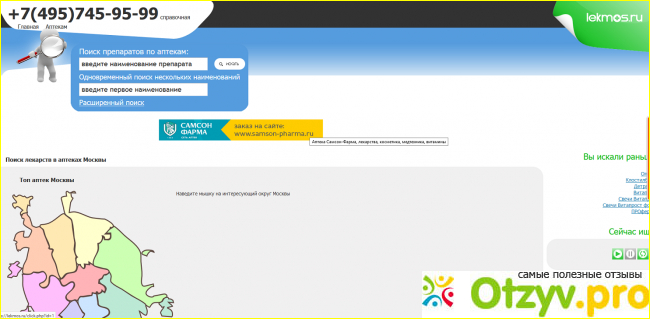 На главной странице сайте размещена исходная информация о том, что можно найти полезного для себя на нем. А именно: на карте можно увидеть аптеки Москвы и Московской области, ассортимент, цены, адреса и др.