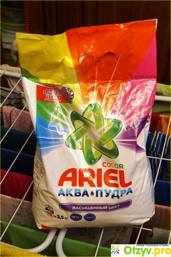 В этом Отзыве я хочу поделиться своим мнением о новинке средства для стирки под названием: «ARIEL Аква Пудра насыщенный цвет» хорошо известного всем бренда. Начнем с внешнего вида упаковки. Продается это средство в мягком пакете в очень яркой упаковке.